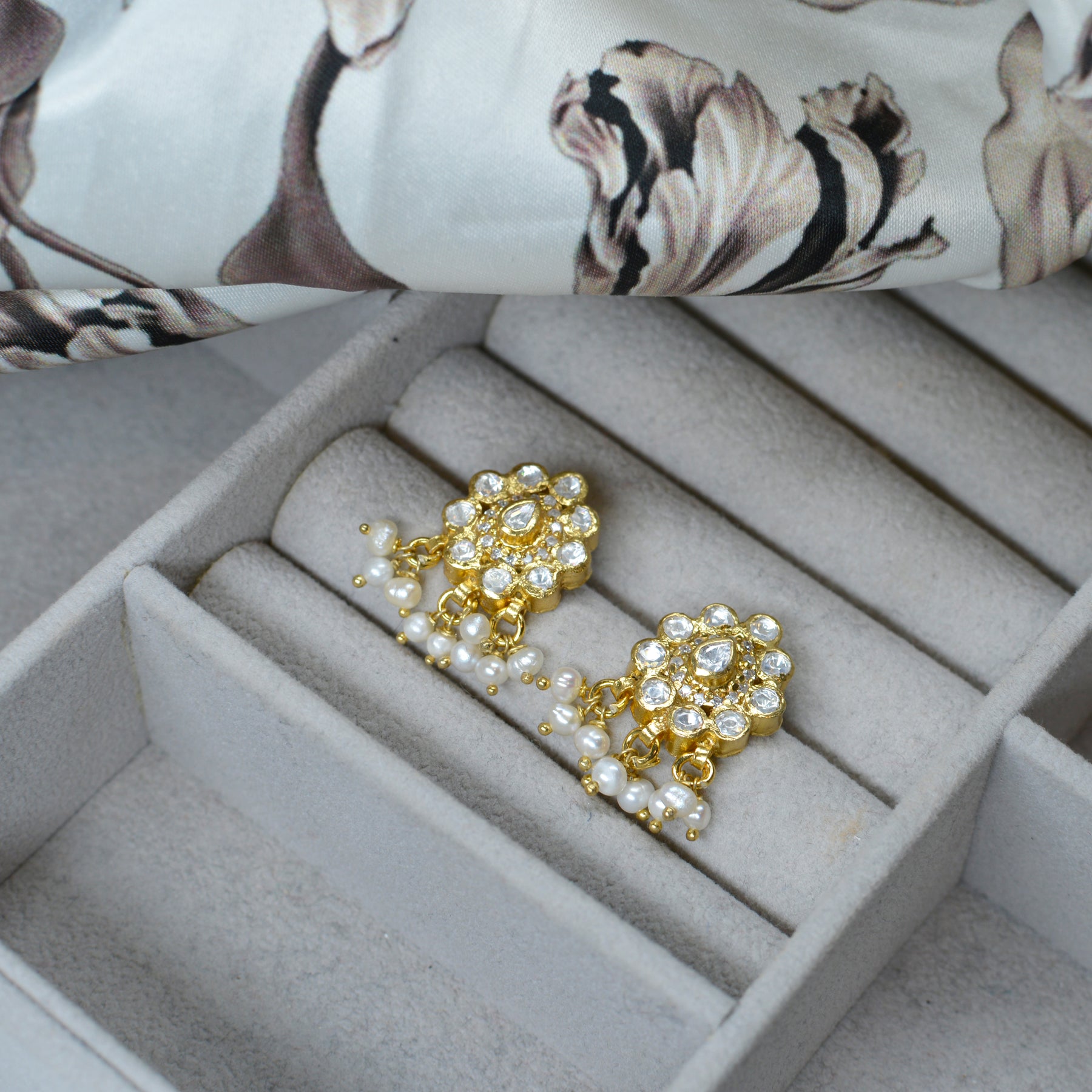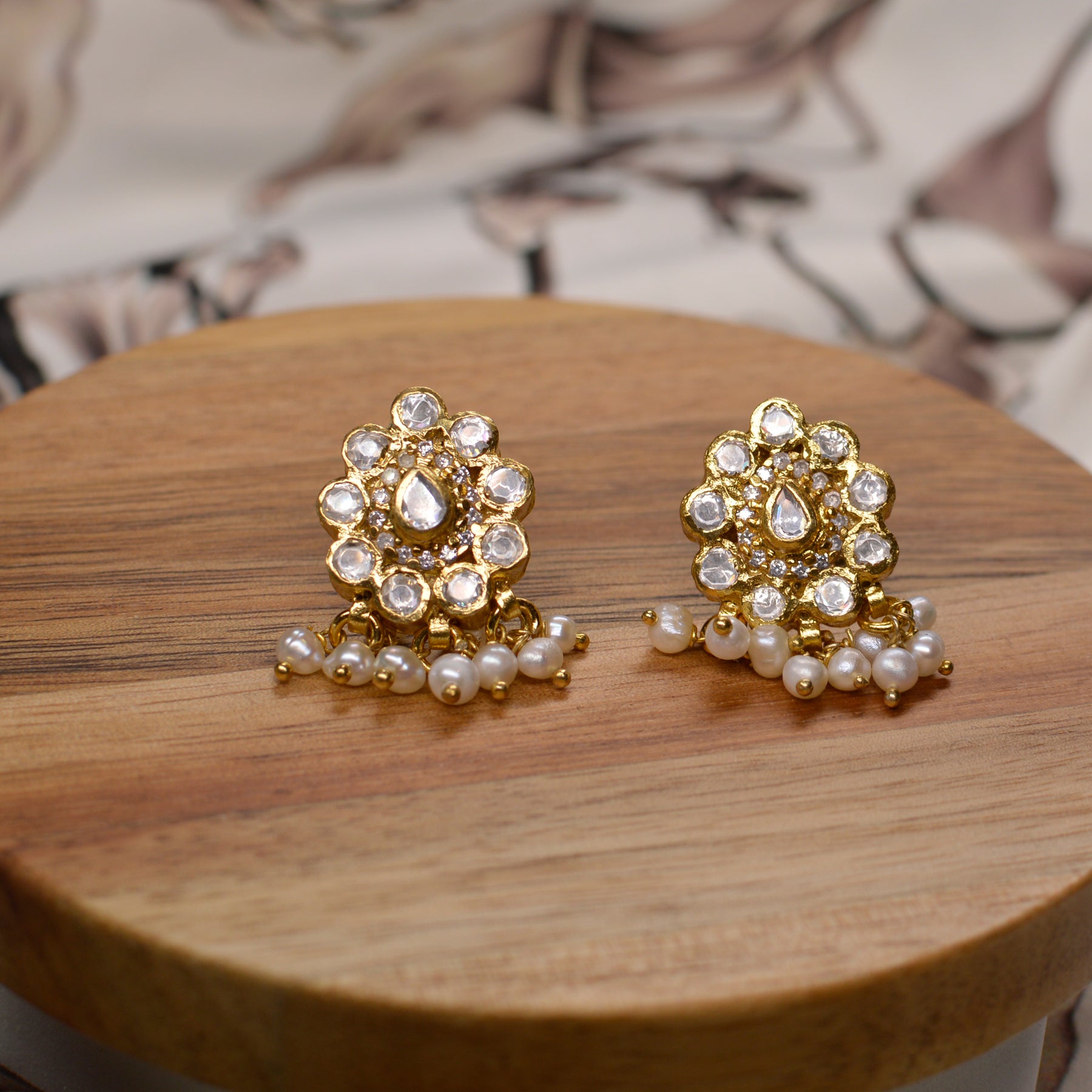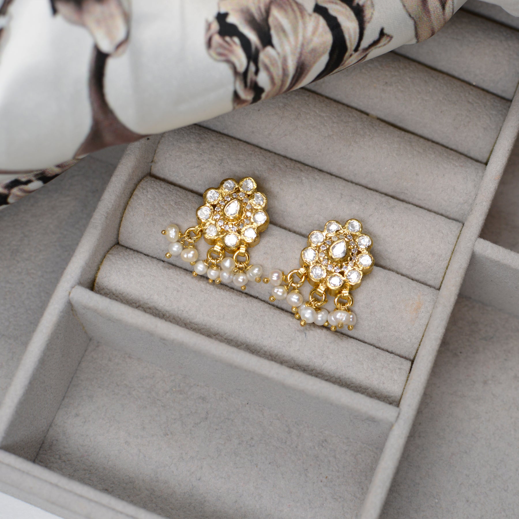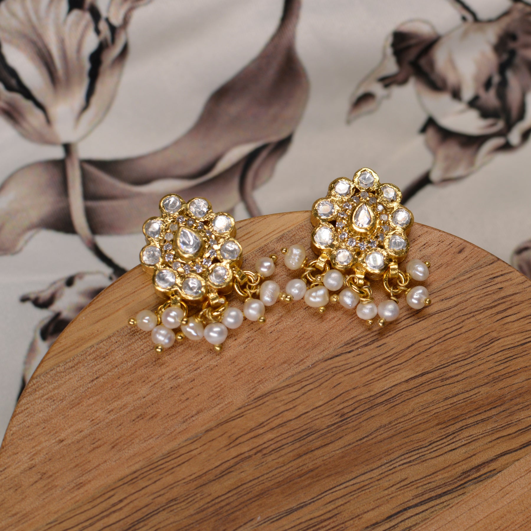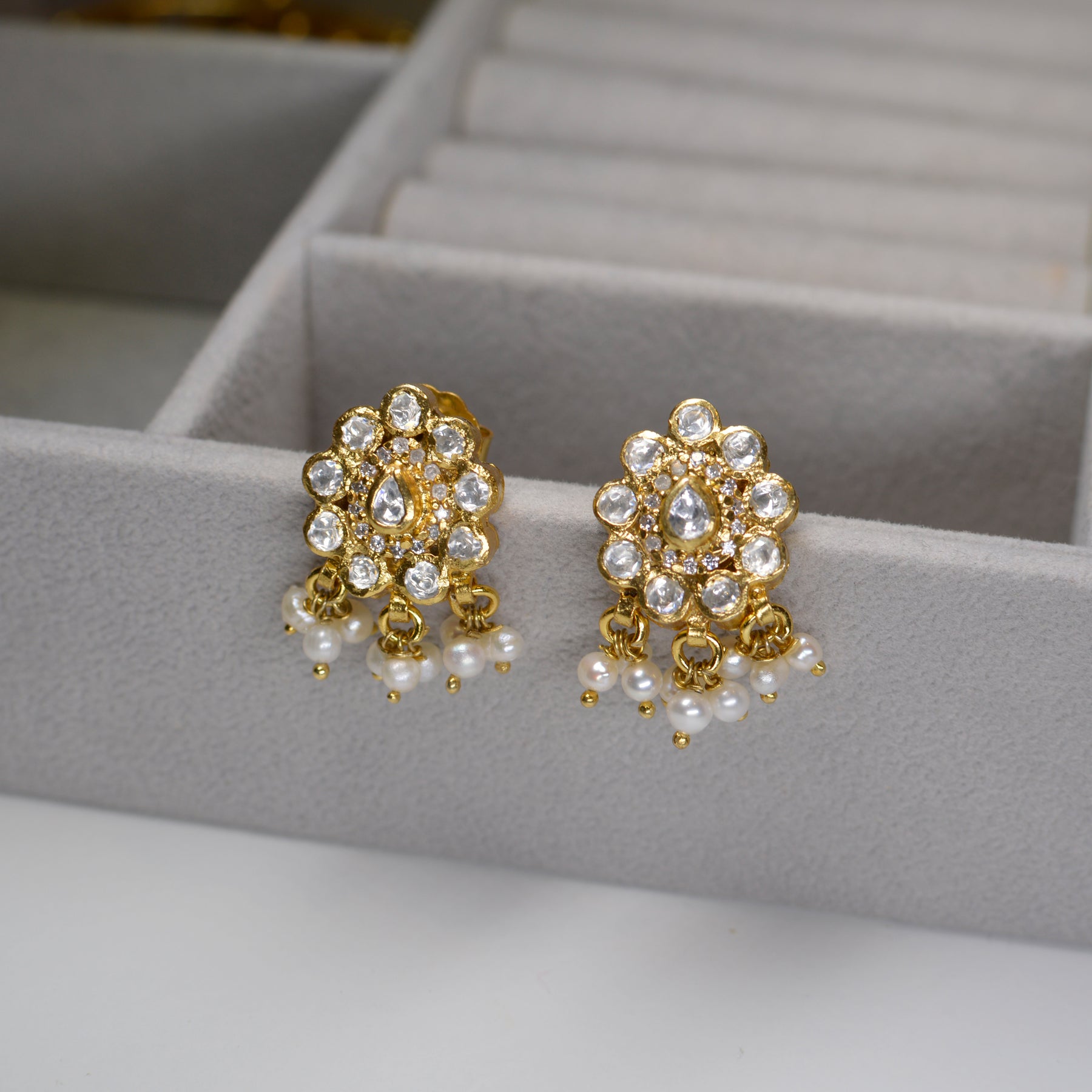 Elevate your look with these heritage-inspired stud earrings, crafted in sterling silver and finished with luxurious 22ct gold plating. Adorned with luminous pearls and sparkling moissanite, they blend classic elegance with modern brilliance perfect for both festive occasions and refined everyday wear.