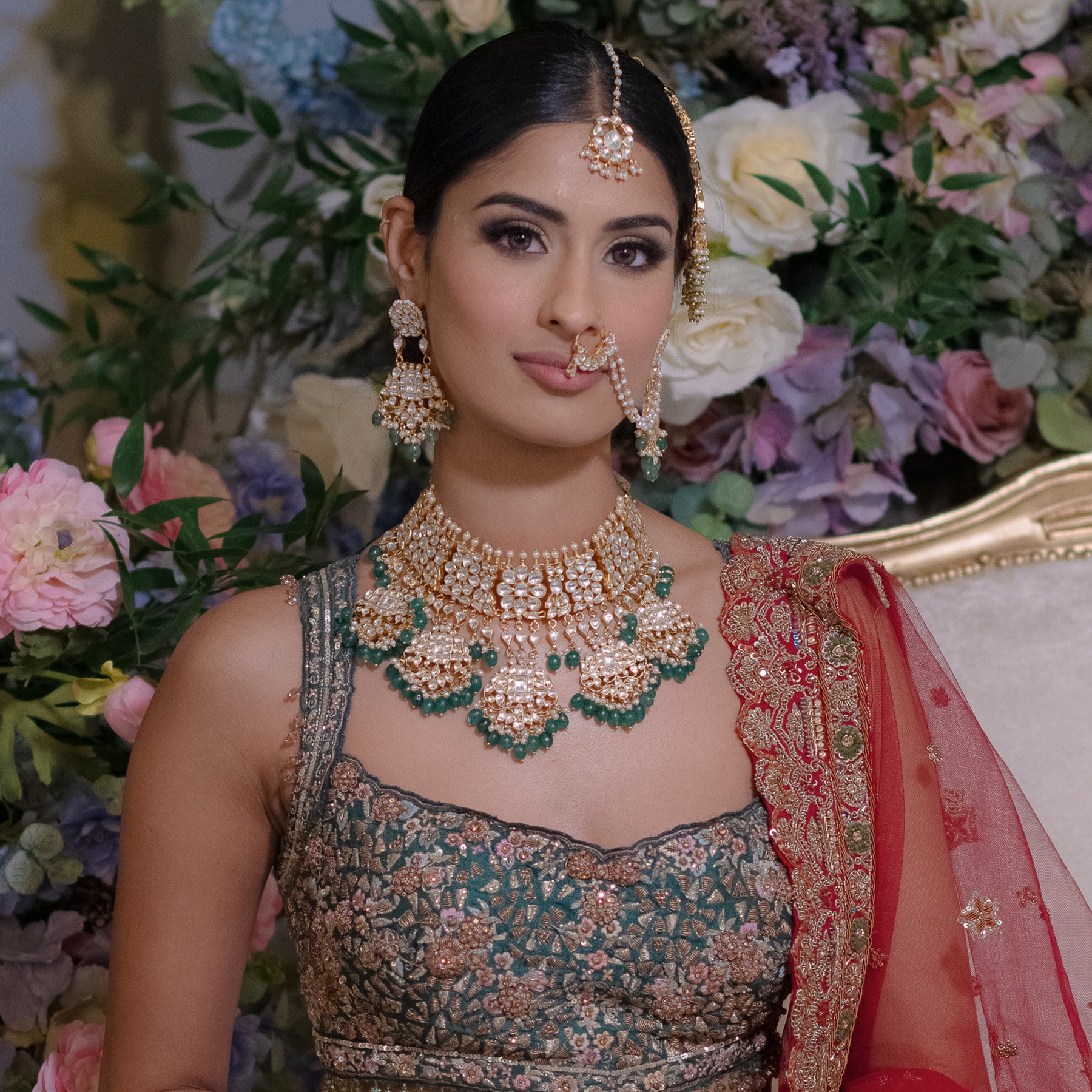 A striking kundan necklace adorned with lustrous emerald green beads, designed to make an elegant statement. Handcrafted with traditional detailing, it pairs beautifully with bridal and festive ensembles. A timeless piece that adds regal charm and refined sophistication.