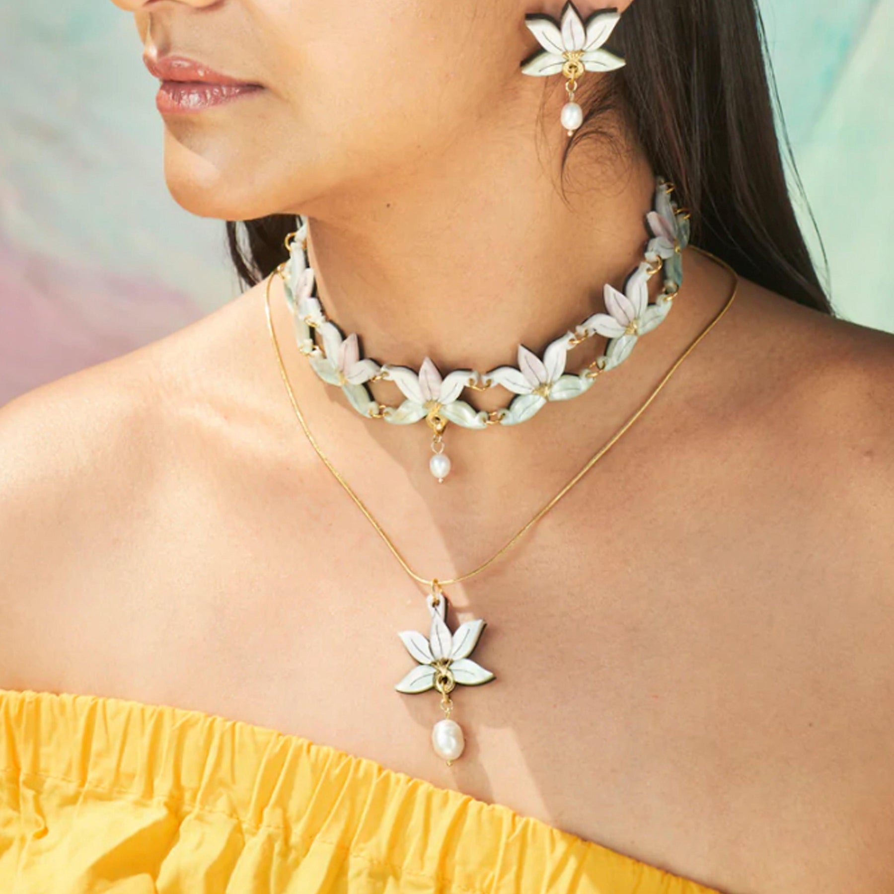 This floral choker is inspired by mogra gajra - jasmine garlands that are worn by women in India during special occasions or simply as part of their daily attire. The scent of jasmine is a core part of my Paradise space, as I wore these flowers during my wedding day and so the scent is really special to me. This choker is made of individual marble acrylic jasmine flowers with a hanging fresh-water pearl. Pair with the mogra studs and tika for the complete look.